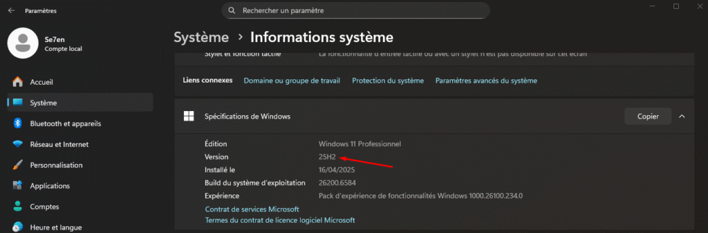 Avant de commencer, veuillez vous assurer d’avoir la version Windows 11 25H2 sur votre PC. Veuillez accéder aux Paramètres de Windows, onglet Système. La mention 25H2 doit apparaitre